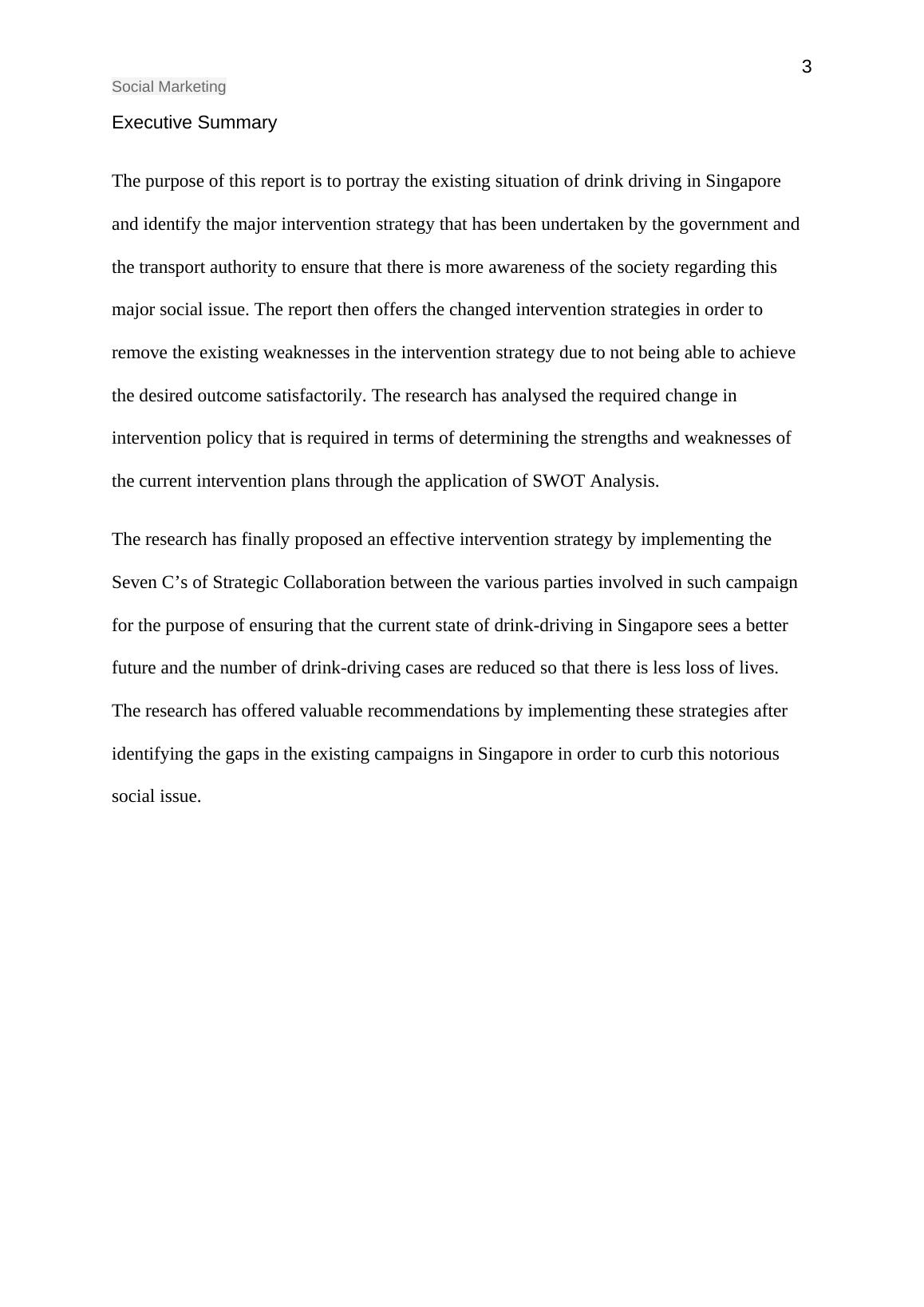 This report provides a comprehensive analysis of social marketing campaigns in Singapore designed to combat drink driving. It begins with an overview of the social issue, highlighting its impact and prevalence. The report then critically evaluates existing interventions, including campaigns by the government, traffic police, and NGOs, assessing their effectiveness and outcomes. A SWOT analysis is applied to identify strengths, weaknesses, opportunities, and threats within the current strategies. The report proposes modifications to existing interventions, including the implementation of the Seven C's of Strategic Collaboration to enhance campaign effectiveness. The report concludes with recommendations for future campaigns, emphasizing the importance of a multi-faceted approach involving digital marketing tools and collaboration between various stakeholders. The report aims to provide valuable insights into the development of successful social marketing strategies to reduce drink-driving incidents and promote road safety in Singapore. The report draws from data and statistics from various sources, including the Singapore Traffic Police and the World Health Organization. The report also looks at the decline in drink driving arrests and accidents in Singapore. This report offers valuable recommendations by implementing these strategies after identifying the gaps in the existing campaigns in Singapore in order to curb this notorious social issue.
