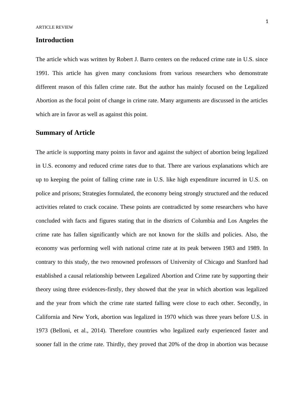 This assignment presents an article review focusing on the complex relationship between healthcare economics and crime rates, specifically examining the impact of legalized abortion. The review analyzes the arguments presented in the article, including the viewpoints of various researchers and the author's perspective. It explores the factors contributing to the reduction in crime rates, such as increased spending on law enforcement, strategic initiatives, a strong economy, and reduced drug-related activities. The review also delves into the debate surrounding the causal relationship between legalized abortion and crime rates, referencing studies by the University of Chicago and Stanford, and considering the influence of these factors on different demographics. Ultimately, the review concludes that while legalized abortion may have a localized effect, other factors also play a significant role in influencing crime rates, encompassing a broader perspective on the economic and social dynamics at play.