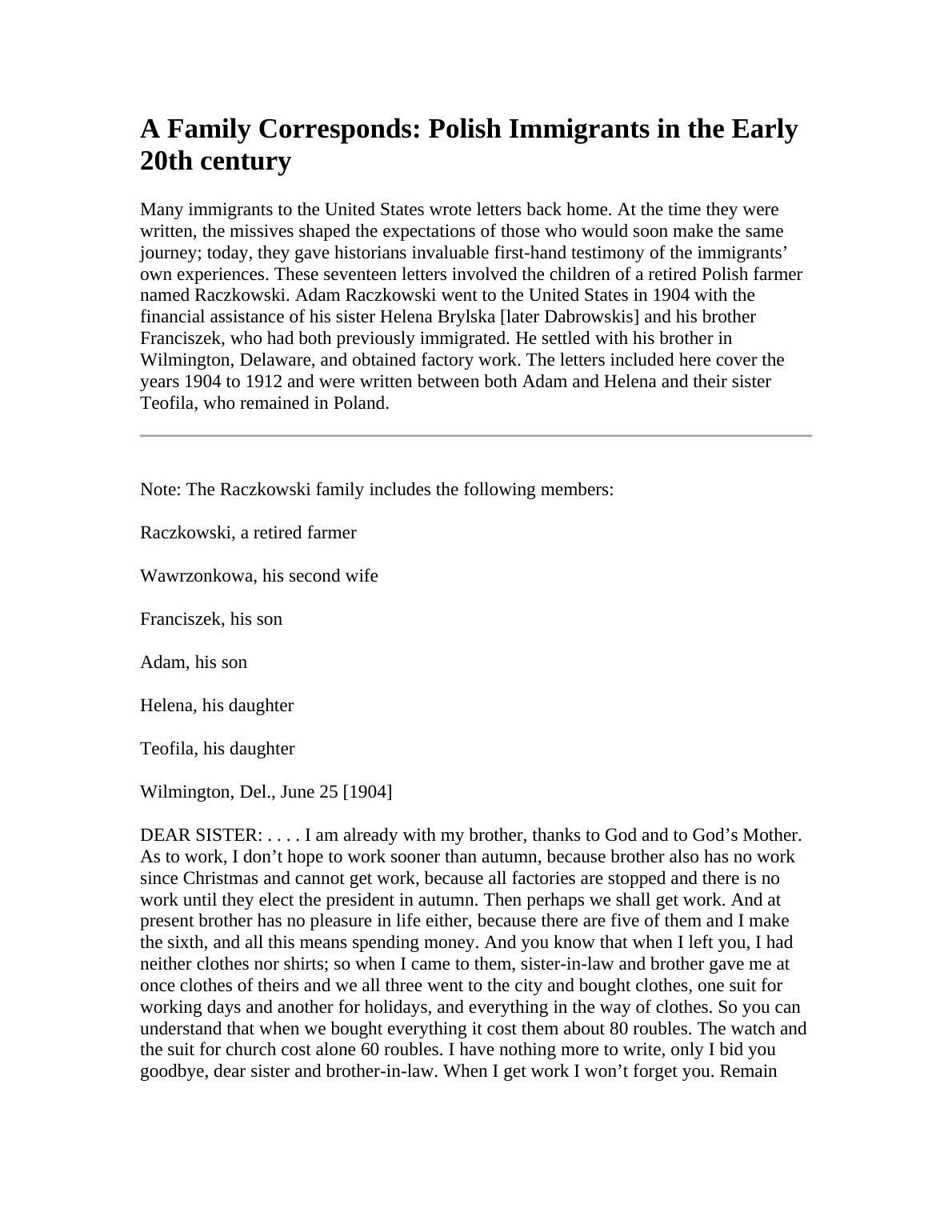This report analyzes a collection of seventeen letters written between 1904 and 1912 by members of the Raczkowski family, Polish immigrants to the United States. The letters offer a firsthand account of their experiences, including the challenges of finding work, adapting to a new culture, and maintaining family ties across continents. The letters detail the struggles faced by Adam and Helena Raczkowski and their brother Franciszek, highlighting the economic hardships and social adjustments they encountered. The correspondence also reveals family dynamics, personal relationships, and the immigrants' perspectives on life in both Poland and America. The letters provide valuable historical insight into the immigrant experience in the early 20th century, offering a glimpse into the hopes, dreams, and realities of Polish families seeking a better life in the United States.