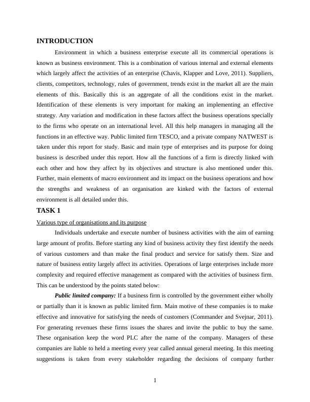 This report provides an analysis of the business environment, examining various types of organizations including public limited companies (Tesco), private companies (Natwest), and voluntary sectors (Oxfam). It explores the purpose and scope of different organizational structures, including sole traders, partnerships, and franchising. The report details the relationship between organizational functions, such as production and design, and the overall objectives and structure of a firm. It highlights the importance of financial management and the impact of the macro environment on business operations. The analysis covers the legal structures of public and private companies, as well as the role of government and the voluntary sector in the business landscape. The report also examines the scope and operations of Tesco, Natwest, and Oxfam, illustrating how each organization functions within its respective sector and how they cater to their customers.