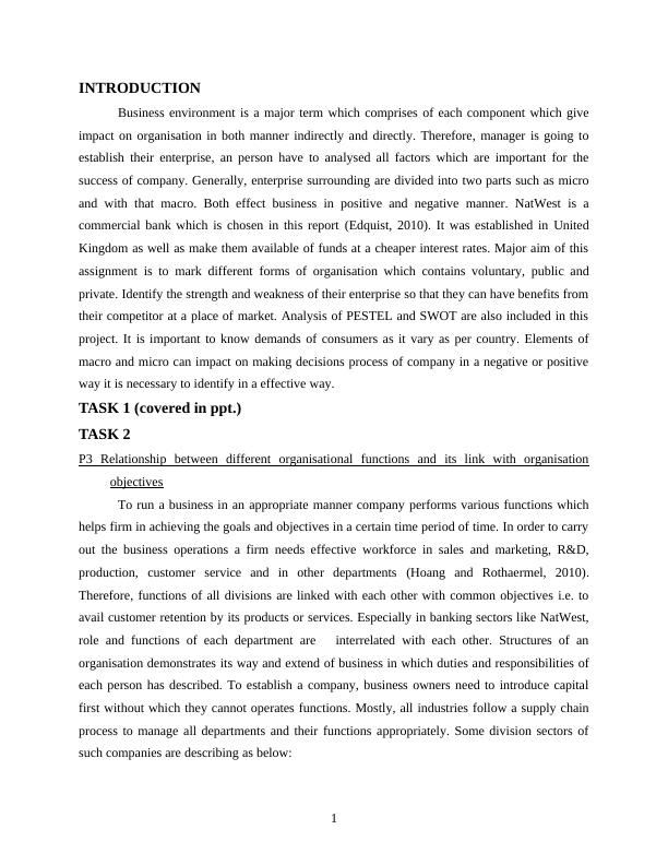 This report provides a comprehensive analysis of the business environment, focusing on NatWest Bank. It begins with an introduction to the concept of the business environment and its impact on organizations, followed by an examination of the relationship between different organizational functions and their alignment with organizational objectives. The report then delves into the positive and negative impacts of the macro environment, utilizing PESTLE analysis to assess political, economic, social, technological, environmental, and legal factors. Furthermore, it includes internal and external analysis to identify the bank's strengths and weaknesses, linking these findings to external factors. The report explores the interrelation between internal strengths and weaknesses with external factors, providing a detailed understanding of the bank's position within its environment and concludes with references. The report is structured to provide insights into the bank's operations, strategic planning, and ability to navigate the complexities of the business world, contributing to the broader understanding of business management and the banking sector.