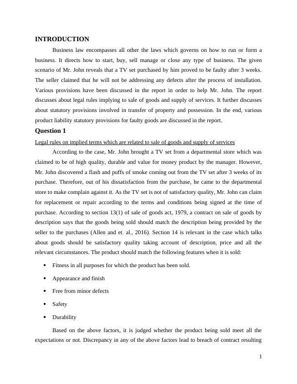 This report delves into the realm of business law, particularly focusing on the sale of goods and the supply of services. It commences with an introduction to business law, setting the stage for an analysis of a case involving a faulty TV set purchased by Mr. John. The report then meticulously examines legal rules concerning implied terms related to the sale of goods and services, providing a comprehensive understanding of the obligations of both sellers and buyers. It further offers advice to Mr. John based on statutory provisions concerning the transfer of property and possession, elucidating his rights and the seller's responsibilities. The core of the report centers on statutory provisions pertaining to buyer's and seller's remedies in sales of goods contracts, detailing the recourse available to Mr. John in light of the defective product. Finally, the report concludes with an exploration of applicable product liability statutory provisions for faulty goods, offering a holistic view of the legal framework. The report emphasizes the Consumer Rights Act 2015 and its implications in safeguarding consumer rights. The report aims to provide a comprehensive understanding of the legal principles involved in the sale of goods and services and how these principles apply to real-world scenarios. The assignment is contributed by a student to be published on the website Desklib, a platform which provides all the necessary AI based study tools for students.
