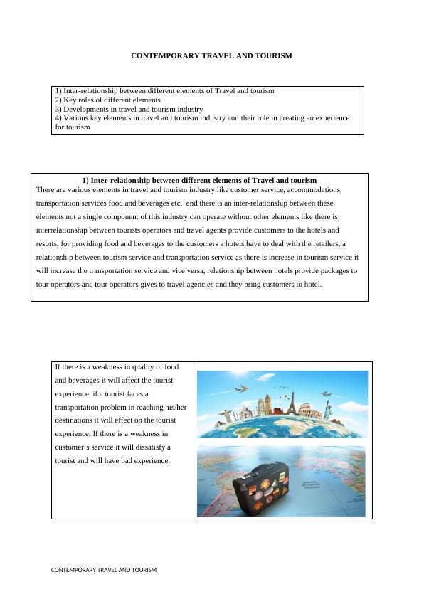 This report provides a comprehensive analysis of the contemporary travel and tourism industry. It begins by examining the interrelationships between various elements such as customer service, accommodations, and transportation, highlighting how they depend on each other for success. The report then delves into the key roles of these elements, illustrating how tourist operators, customer service, accommodations, and accessibility contribute to the overall tourist experience. Furthermore, the report explores the historical developments in the travel and tourism industry, tracing the evolution from exclusive travel for the wealthy to the globalized industry of today, driven by technological advancements and changing consumer lifestyles. It also discusses the key elements in the industry and their impact on creating a positive experience for tourists, including factors like pleasant weather, cultural and historical attractions, accessibility, accommodations, and safety. The report concludes by emphasizing the importance of these elements and their interconnectedness, providing insights into the industry's dynamics and future trends. It also includes references to support the analysis.