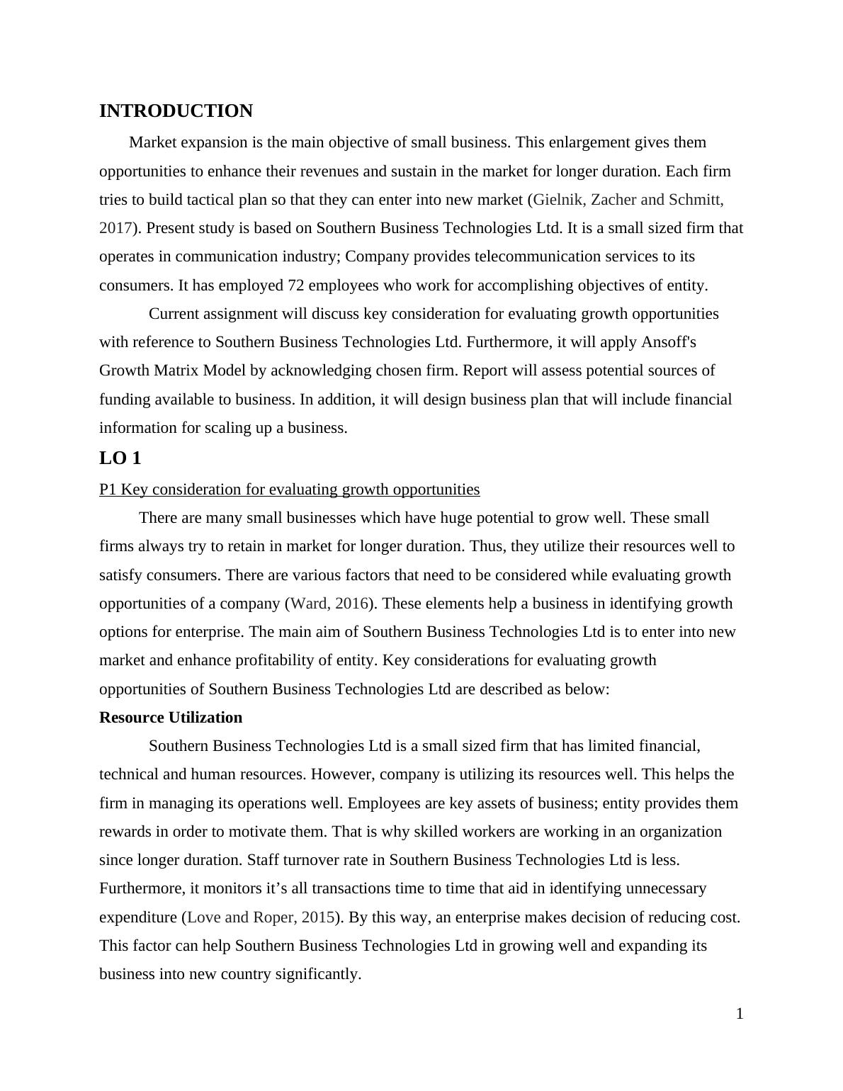 This report examines growth opportunities for Southern Business Technologies Ltd., a telecommunications company. It begins by identifying key considerations for evaluating growth, including resource utilization, capabilities, and market analysis using Porter's Five Forces. The report then applies Ansoff's Growth Matrix, assessing market penetration, product development, and diversification strategies. It evaluates potential funding sources, including self-funding and bank loans, and designs a business plan with financial information. The report also discusses succession options for small businesses. Overall, the report provides a comprehensive analysis of growth strategies and financial planning for Southern Business Technologies Ltd., aiming to guide the company's expansion and market positioning within the telecommunications industry.