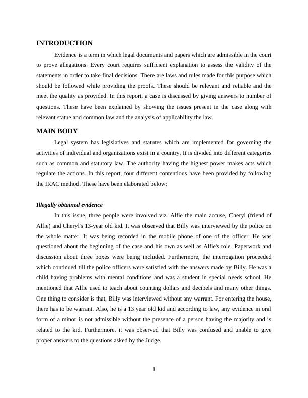 This report presents a comprehensive analysis of an evidence law case, examining various aspects of evidence admissibility and legal principles within the Australian legal framework. The case involves issues such as illegally obtained evidence, focusing on the admissibility of a minor's interview conducted without a warrant and the application of s138 of the Evidence Act. It also discusses the power of the judge in assessing evidence, including the application of s189 (voir dire) and s142, and the admissibility of secondary evidence versus primary evidence. The analysis further addresses the reliability of changing statements from witnesses, considering s165A and the impact of potential biases. The report references key legal cases and statutes to support its arguments, providing a detailed understanding of evidence law and its application in the Australian legal system.