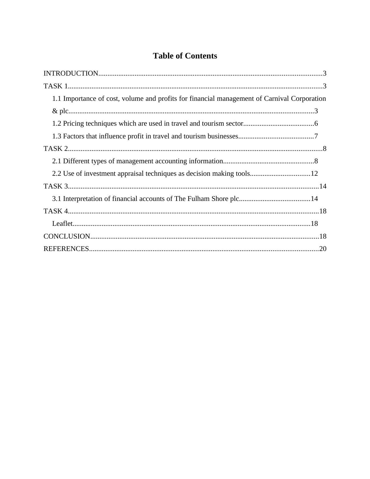 This report provides a comprehensive analysis of finance and funding within the travel and tourism sector. It begins by examining the importance of cost, volume, and profits for financial management, using Carnival Corporation & plc as a case study. The report then explores various pricing techniques used in the industry and identifies factors that influence profit. Furthermore, it delves into management accounting information, including budget reports, financial statements, variance analysis, and job costing reports, using The Fulham Shore plc as a context. The report also covers the use of investment appraisal techniques and concludes with an interpretation of the financial accounts of The Fulham Shore plc. A leaflet is also included as part of the assignment.