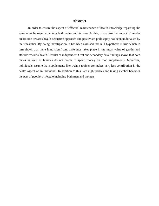 This report investigates the influence of gender on attitudes towards health, employing a deductive approach and positivism philosophy. The study utilizes both primary data from surveys and secondary data from journals to analyze the relationship between gender and health-related behaviors. Key findings suggest that there is no significant difference in health attitudes between genders, particularly regarding spending on supplements and lifestyle choices such as alcohol consumption. The research explores the factors considered by men and women for ensuring better health, highlighting the changing lifestyles of both genders and the increasing prevalence of habits like smoking and drinking. Statistical analysis, including independent sample t-tests, supports the conclusion that while there are some differences in specific behaviors, overall health attitudes are not significantly impacted by gender. The study also discusses ethical considerations and provides a comprehensive overview of the research methodology and results.