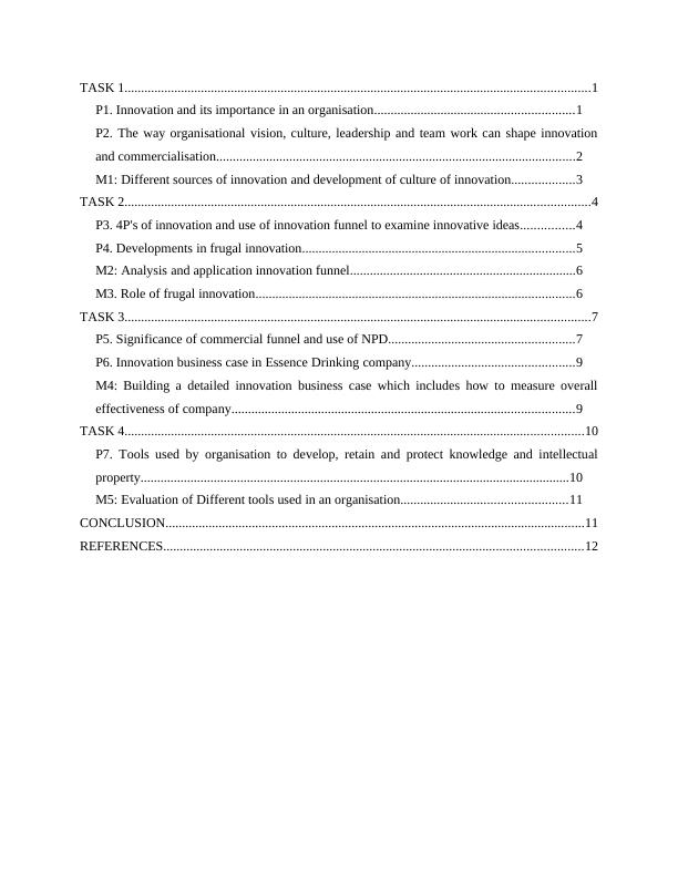 This report provides a comprehensive overview of innovation and commercialisation within a business context, using the "Essence Drink Company" as a case study. It explores the importance of innovation, examining how organizational vision, culture, leadership, and teamwork shape innovation and commercialization. The report delves into the 4Ps of innovation, the innovation funnel, and frugal innovation, analyzing their application in the business environment. It further discusses the significance of the commercial funnel, new product development (NPD), and building a detailed innovation business case. Finally, the report addresses tools for developing, retaining, and protecting knowledge and intellectual property, concluding with an evaluation of these tools.