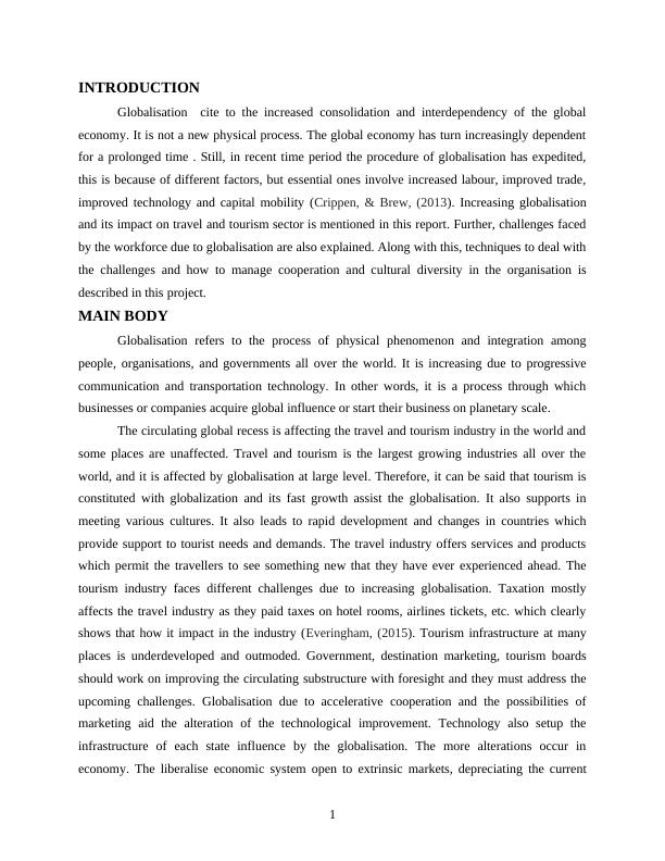 This report explores the intricate relationship between globalisation and the tourism industry, highlighting the increasing interdependence of the global economy and its effects on travel and tourism. It delves into the challenges faced by the tourism workforce due to globalisation, such as taxation, underdeveloped infrastructure, and income inequalities. The report further examines the complexities of managing a culturally diverse workforce within the tourism sector, including challenges like increased costs, discrimination, and communication issues. It proposes various management techniques to address these challenges, such as promoting cultural awareness, establishing effective communication systems, developing diversity training programs, and implementing language banks. The report concludes by emphasizing the importance of cultural sustainability and cooperation in the tourism industry for long-term growth and sustainable development, including the need for effective development cooperation to promote cultural diversity and address workplace issues.