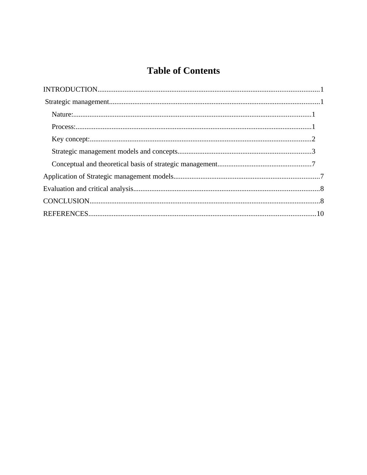 This report provides a comprehensive overview of strategic management, defining its nature, process, and key concepts. It explores the evolution of strategic management from military origins to its application in various industries, emphasizing its role in bridging the gap between policies and tactics to achieve organizational goals. The report details the strategic management process, including environmental analysis, strategy formulation, implementation, and evaluation, and examines strategic management models such as Andrew's, Glueck's, and Schendel and Hofer's models. It critically analyzes each model, discussing their strengths and weaknesses in addressing cost, competition, and customer satisfaction. The report also covers the importance of strategic planning in meeting market challenges, maximizing consumer support, and using various tools to lower costs and increase revenue. The models are evaluated in terms of their contribution to decision-making, goal formulation, environmental analysis, strategy formulation, and evaluation. The report concludes by highlighting the dynamic nature of the business environment and the need for continuous adaptation in strategic management.