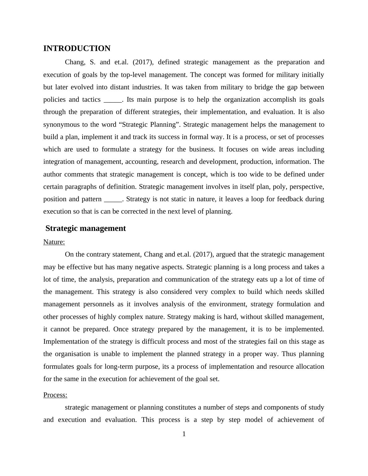 Chang, S. and et.al. (2017), defined strategic management as the preparation and