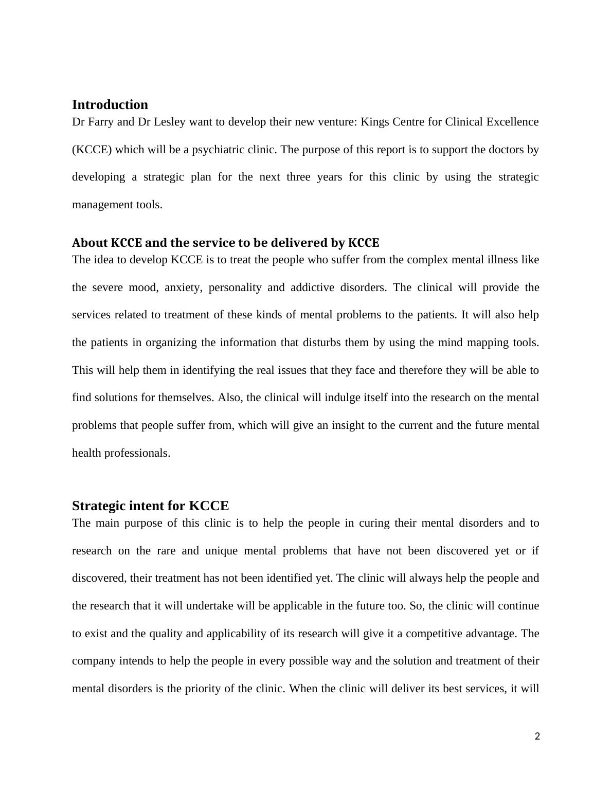 This report provides a comprehensive strategic plan for Kings Centre for Clinical Excellence (KCCE), a psychiatric clinic. It begins with an introduction, outlines the clinic's services, and defines its strategic intent, core values, and mission statement. The report then employs various strategic management tools, including SWOT, PESTEL, Porter's Five Forces, Competitive Profile Matrix, VRIO framework, Boston Matrix, Bowman’s Strategy Clock, and Business Model Canvas, to analyze the clinic's internal and external environments. The analysis covers strengths, weaknesses, opportunities, and threats, as well as political, economic, social, technological, environmental, and legal factors. Furthermore, it assesses the competitive landscape and the clinic’s resources and capabilities. The report concludes with a discussion of key performance indicators (KPIs) and references.