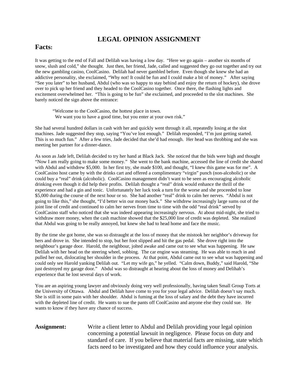 This case study presents a legal scenario involving Delilah, who incurs significant debt and causes property damage after a visit to CoolCasino. The assignment requires students to write a legal opinion letter to Delilah and Abdul, focusing on the potential for a negligence lawsuit against CoolCasino. The analysis should specifically address the duty of care and standard of care, and identify any missing material facts that could influence the legal analysis. The assignment is a research-based task, requiring students to consider relevant case law and statute law. The final submission should be a 10-page document, formatted according to the specified guidelines.