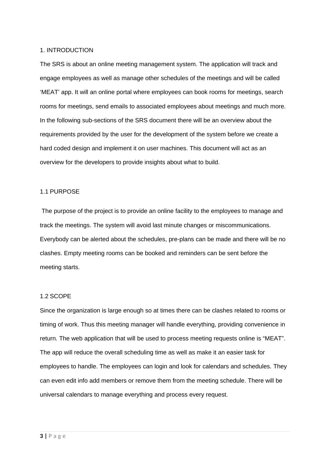 The provided document is a Software Requirements Specification (SRS) for the 'MEAT' application, an online meeting management system designed to enhance employee engagement and streamline meeting scheduling. The SRS outlines the application's purpose, scope, and benefits, including features like room booking, schedule management, and reminder functionalities. It details the product perspective, encompassing user interfaces, hardware and software interfaces, and memory constraints. Furthermore, the document specifies functional and performance requirements, design constraints, and other considerations such as security, maintainability, and portability. The SRS also includes use case diagrams and descriptions to illustrate the system's functionality, such as scheduling meetings, user login, and editing schedules. The document is intended to provide a comprehensive overview for developers to guide the design and implementation of the MEAT application.