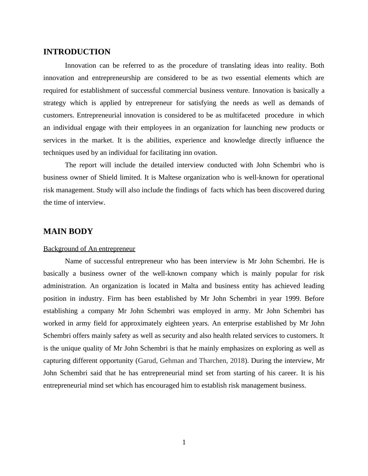 This report presents an analysis of an interview conducted with Mr. John Schembri, the owner of Shield Limited, a Maltese company specializing in operational risk management. The report delves into Schembri's entrepreneurial journey, exploring his background, motivations, and the strategies he employed to build his business. It covers topics such as opportunity recognition, innovation, ethical considerations during the interview process, and data analysis of the interview transcript. The report also relates the interview findings to relevant theories of entrepreneurship, including innovation, opportunity, and trait theory. The analysis highlights Schembri's innovative mindset, risk-taking abilities, and strong interpersonal skills, concluding that both entrepreneurship and innovation are essential for establishing a successful business venture. The report offers valuable insights into the practical application of entrepreneurial principles and the importance of adapting to new business ideas.