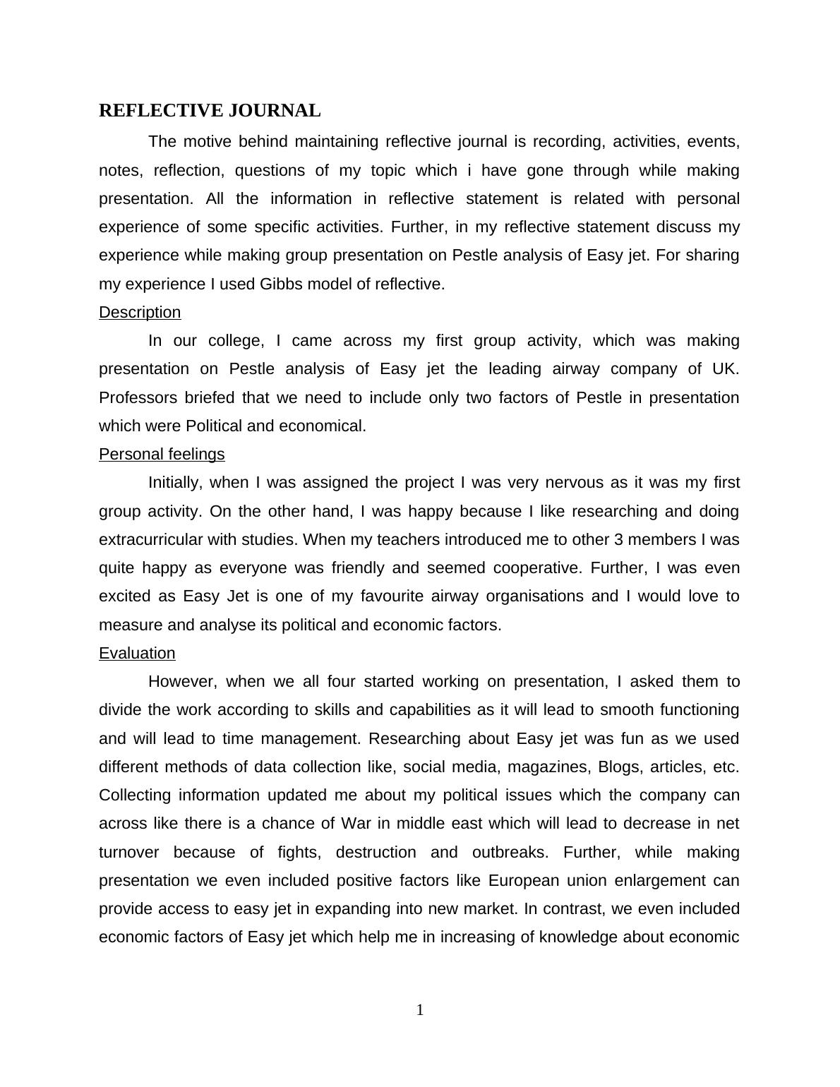 This reflective journal details a student's experience working on a group presentation analyzing the political and economic factors affecting EasyJet using the PESTLE framework. The student reflects on their initial nervousness, excitement, and the challenges of group work, including the absence of team members. The journal describes the research process, data collection methods, and the insights gained regarding political issues (e.g., potential war in the Middle East) and economic factors (e.g., fuel prices and recession). The student uses Gibbs' reflective model to evaluate the experience, discussing personal feelings, the evaluation of the process, conclusions drawn, and action plans for future presentations, including incorporating feedback and improving group coordination. The journal highlights the importance of time management, content selection, and audience engagement to improve presentation skills. The student concludes with a summary of the experience and expresses preparedness for future presentations, emphasizing the ability to work independently and coordinate efforts in a group setting. The student also references relevant academic resources.