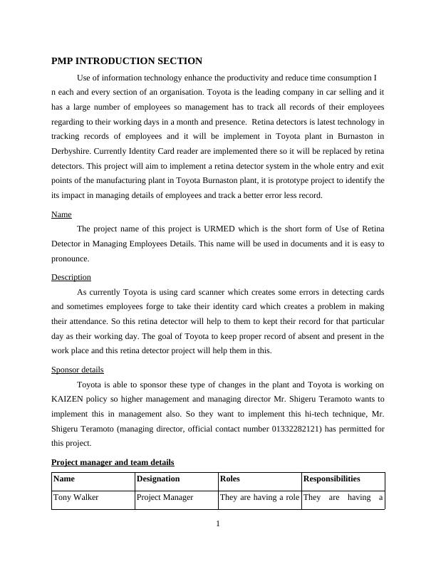 This report analyzes a PMP project proposal titled "URMED" (Use of Retina Detector in Managing Employees Details) for implementation at Toyota's Burnaston plant. The project aims to replace existing card scanners with retina detectors for improved employee attendance tracking. The report includes sections on project introduction, organization, management approach, work to perform, schedule, and budget. It details deliverables, references, and definitions. The management objectives, project controls, and risk management strategies are outlined, along with project staffing and technical processes. The report also discusses major work packages, key deliverables, and the project schedule, although the schedule's summary is lacking. The project team comprises a project manager, senior team leader, works head, IT head, and technical head. The report references project management methodologies and tools. The project's success hinges on effective implementation and management of the retina detector system.