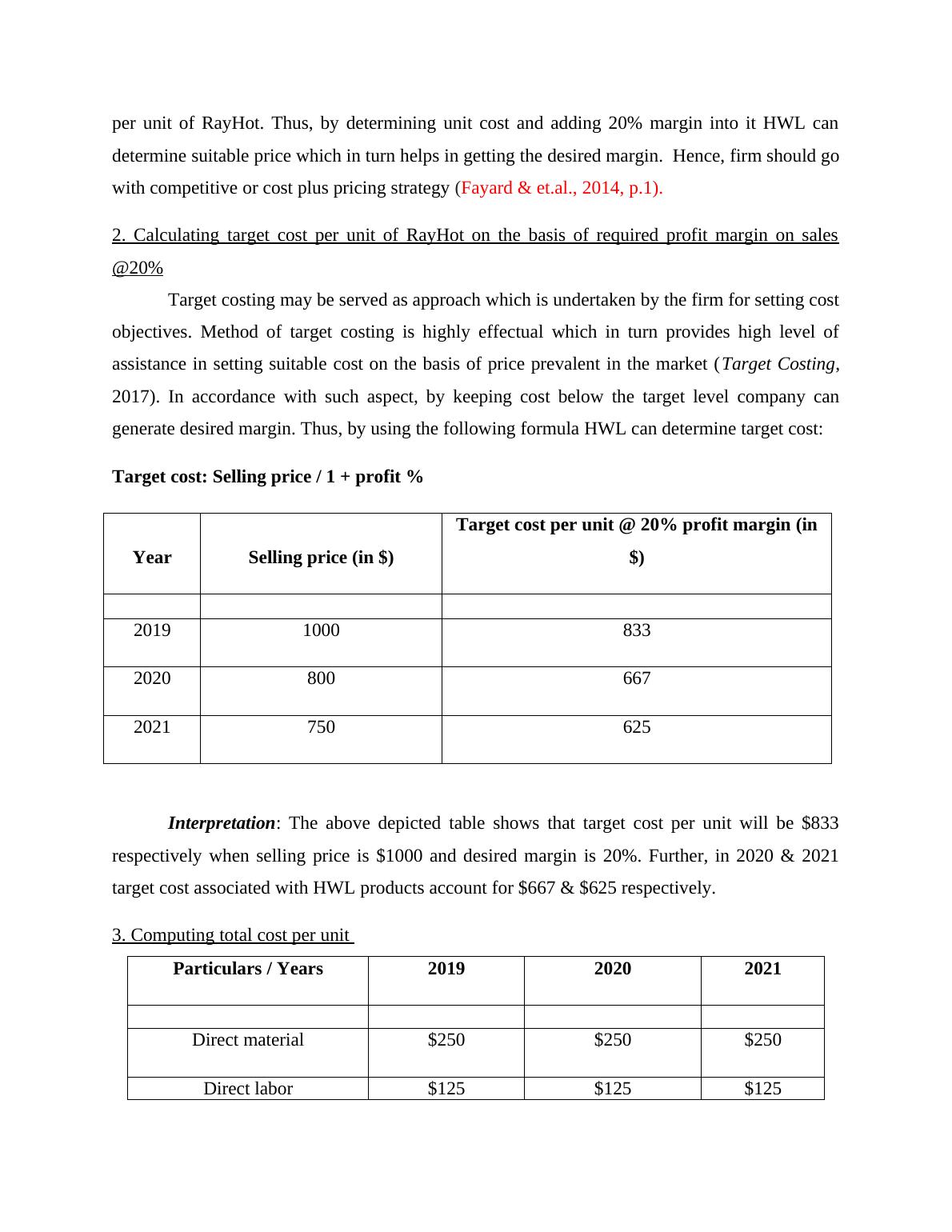 2. Calculating target cost per unit of RayHot on the basis of required profit margin on sales