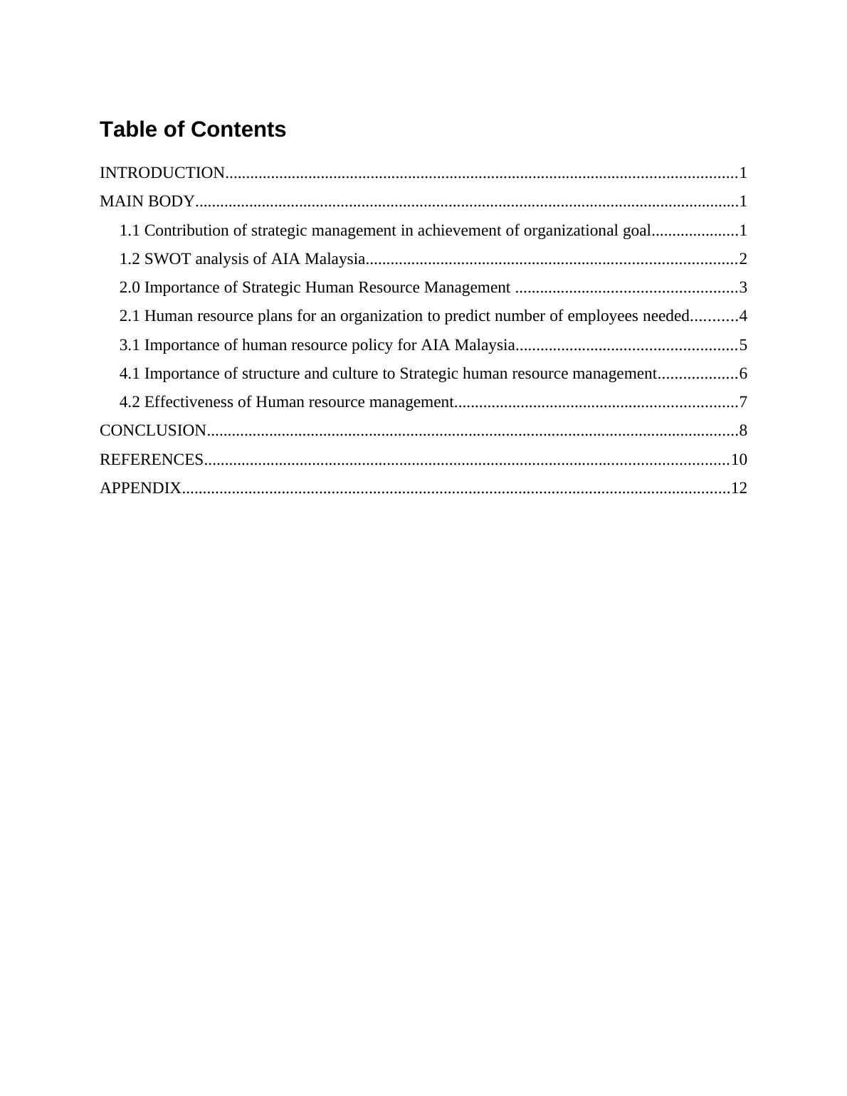 This report provides a comprehensive analysis of Strategic Human Resource Management (SHRM) at AIA Malaysia. It begins with an introduction to SHRM and its importance in achieving organizational goals, focusing on attracting, retaining, and developing employees. The main body includes a SWOT analysis of AIA Malaysia, evaluating its strengths, weaknesses, opportunities, and threats within a dynamic business environment. The report emphasizes the importance of SHRM in aligning business planning with strategic goals, retaining talent, and gaining competitive intelligence. It also explores human resource planning, including forecasting employee needs and the impact of technology, along with the significance of human resource policies in guiding employee practices and mitigating risks. The report discusses how HR policies affect employee satisfaction, motivation, and retention, supporting AIA Malaysia's strategic direction. The report also covers the contribution of strategic management in the achievement of organizational goals, importance of human resource policy for AIA Malaysia, and the importance of structure and culture to strategic human resource management. It provides a detailed overview of SHRM principles and their application in a real-world context, offering valuable insights into effective human resource management strategies within the insurance industry.