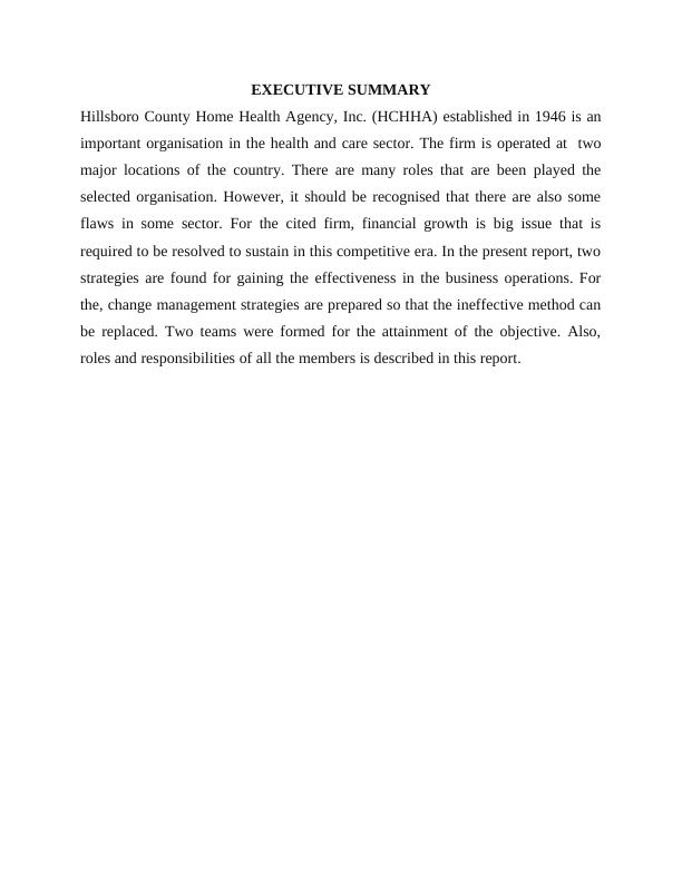 This report presents a strategic plan for Hillsboro County Home Health Agency, Inc. (HCHHA), established in 1946, focusing on addressing financial growth and operational effectiveness. It includes a mission and vision statement, SWOT analysis, identification of major issues such as declining financial performance and limited services, and proposed grand strategies like turnaround and service development. The report outlines operational and tactical plans, including increasing work performance and expanding community health services. Key performance indicators (KPIs) are discussed, along with a detailed change management plan that involves creating visible goals, gathering community feedback, and employing a structured change management process. The report emphasizes the importance of employee training, motivation, and strategic partnerships to achieve the agency's objectives.