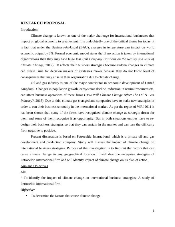This dissertation proposal investigates the impact of climate change on international business strategies, specifically focusing on Petroceltic International, an oil and gas company. It explores the factors causing climate change, analyzes business strategies for operating in various countries, and identifies the impact of climate change on the company's plans. The research aims to recommend ways to mitigate the negative effects of climate change on international business strategies, considering factors like changing oil and gas prices, population growth, and resource decline. The study employs a positivism philosophy and an inductive approach, collecting data from both primary and secondary sources, with data analysis using SPSS. The research also considers ethical aspects, ensuring data reliability and validity, and aims to provide insights for international organizations to adapt and thrive in the face of climate-related challenges. The proposal highlights the significance of the study for governments in managing oil and gas prices and promoting economic development.